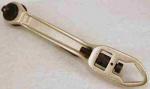 Here's a combination of the equivalent of an 8" crescent wrench and a 3/8" ratchet wrench. The boxed crescent wrench fits nuts and bolts from a 1/4" square (the set-screw on a C-clamp) to a 7/8" hex (the yoke bolt on a C-clamp).
